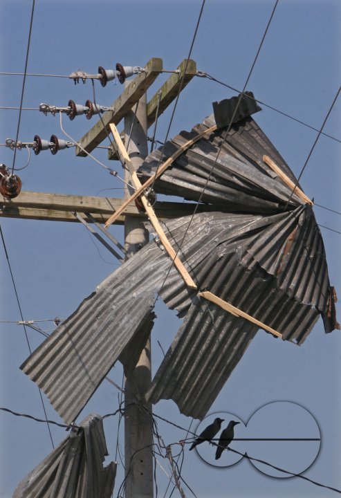 Description : Sheets of tin entangled on electrical wire in Kakchira, Borguna, Bangladesh. Many houses were destroyed by tidal wave on the night of 15th November as cyclone SIDR smashes the coastal areas causing huge damage to lives and properties. In Kakchira, 300 people died and 300 more are missing by the massive hit of the cyclone.