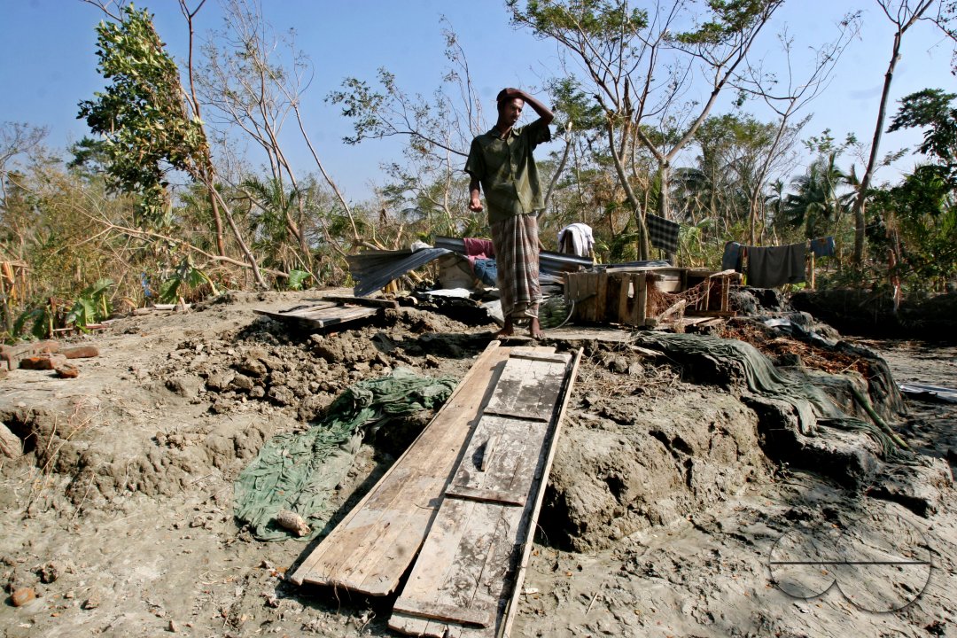 Description : Ratan, a SIDR victim stands in the midst of his ruined house in Kakchira, Borguna, Bangladesh. Many houses were destroyed by tidal wave on the night of 15th November as cyclone SIDR smashes the coastal areas causing huge damage to lives and properties. In Kakchira, 300 people died and 300 more are missing by the massive hit of the cyclone.