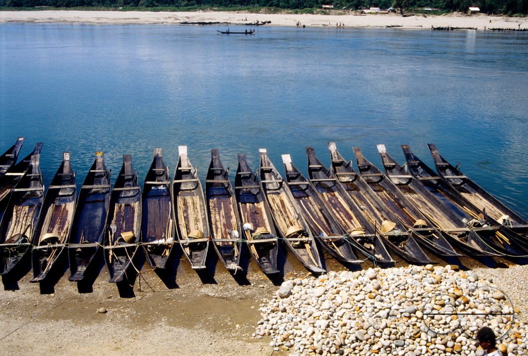 Description : Boats anchored to river banks. Bangladesh.