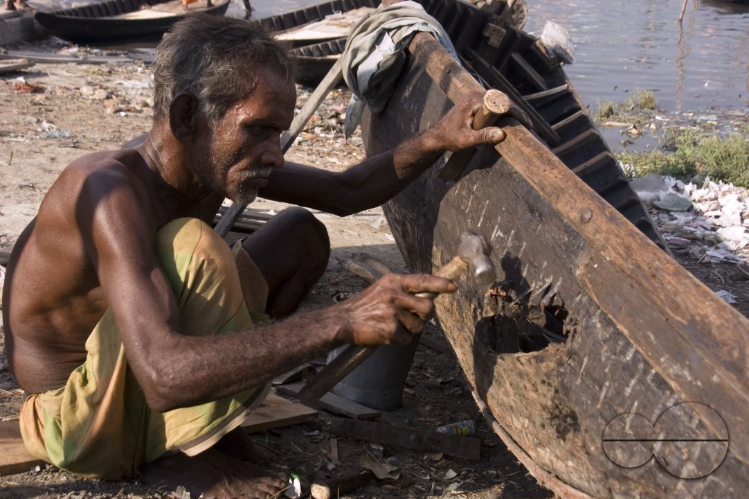 Description : A boat maker repairs a boat on the bank of Burigonga River, Dhaka, Bangladesh. 11 May.