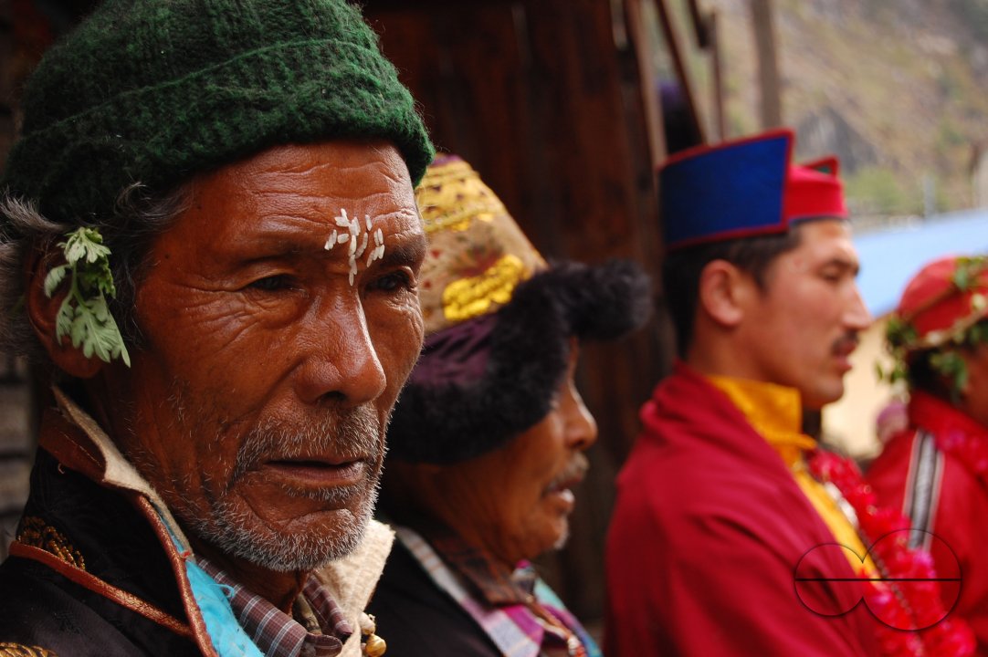 Description : During the Arrow Shooting festival of "Metha", the elders of the village put rice tika (mark) on their forehead. Manang, Nepal.