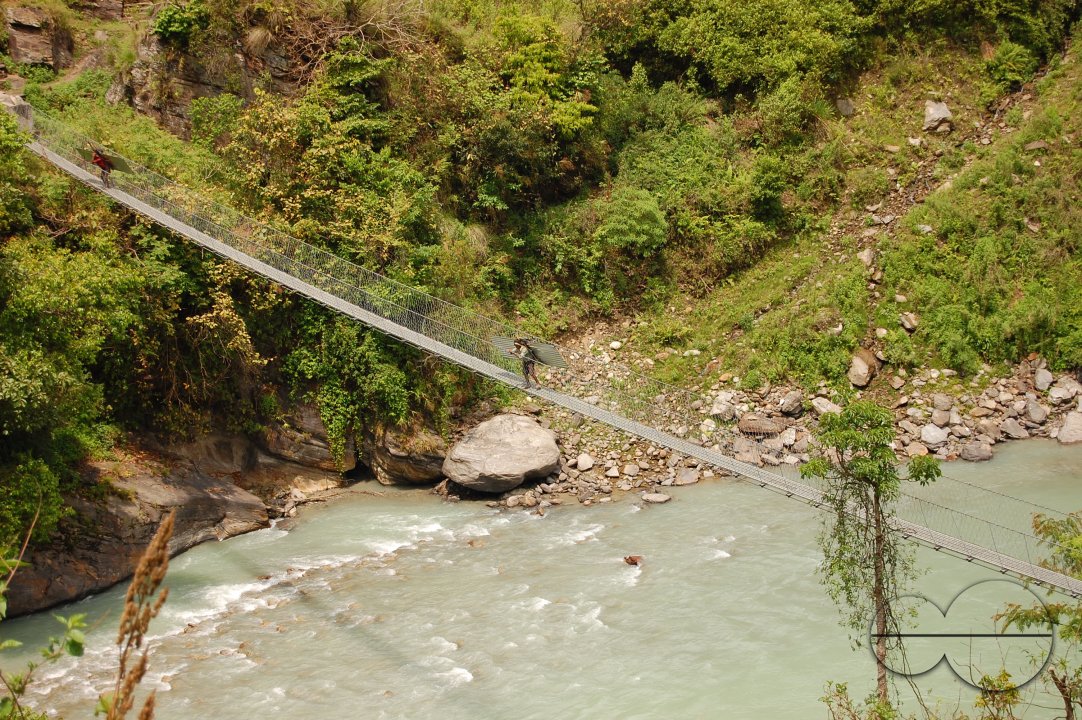 Description : Porters carrying sheets of tin walk slowly on the hanging bridge. Due to lack of roads and transportation, porters are the only hope for supplies to the villagers of Manang area in Nepal.