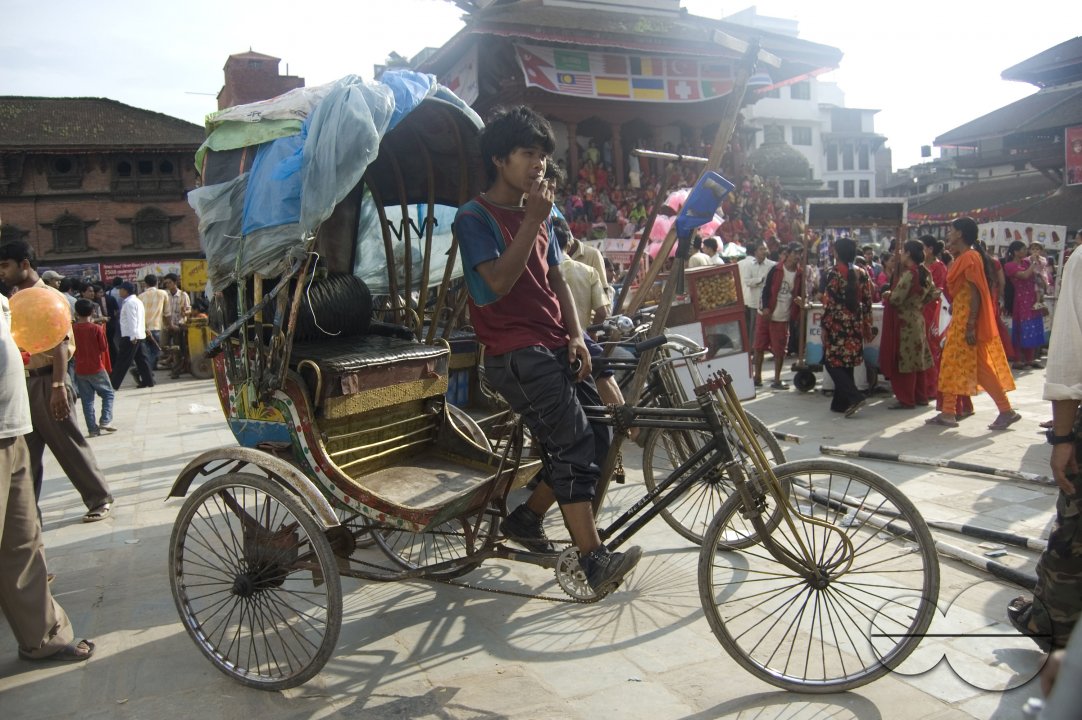 Description : A rickshaw puller smokes and rests while on his other side preparations for a concert goes on. Kathmandu, Nepal.