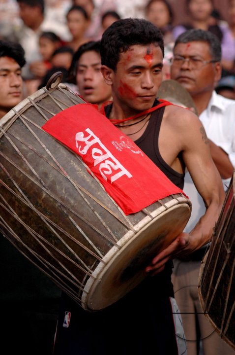 Description : A man playing an instrument (Dhime) in the culture of Newari people in Nepal.