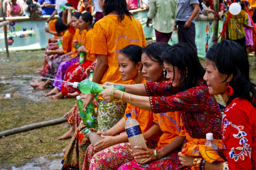 Description : Young ethnic girls celebrating the water festival (new year festival) at Chitmorong, a Buddhist village, about three miles beyond the Kaptai Lake in the hill district of Rangamati, in Chittagong, Bangladesh.