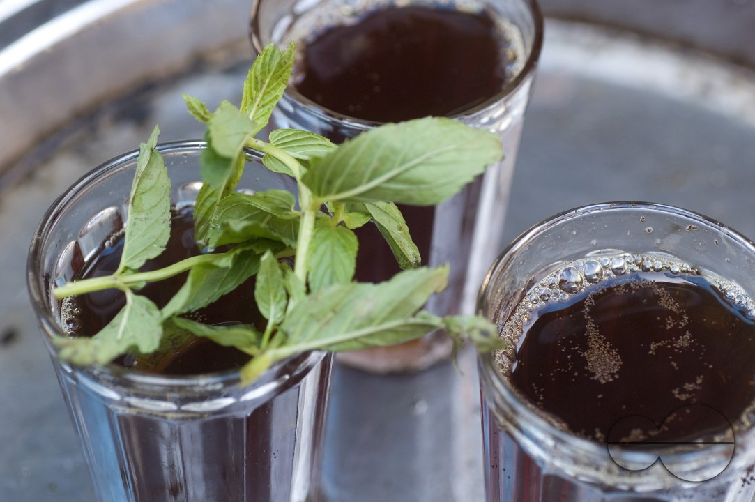 Description : Glasses of mint tea, a popular drink in the region. Yemen.