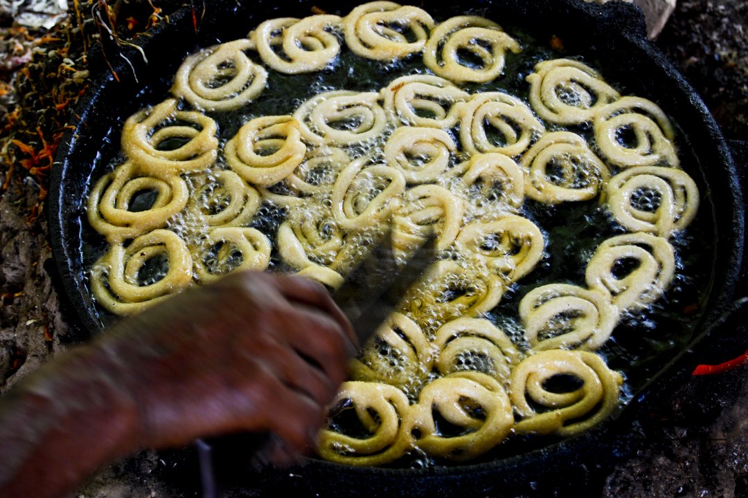 Description : Jilapis (local sweet) are being fried, at a restaurant in Chittagong, Bangladesh.