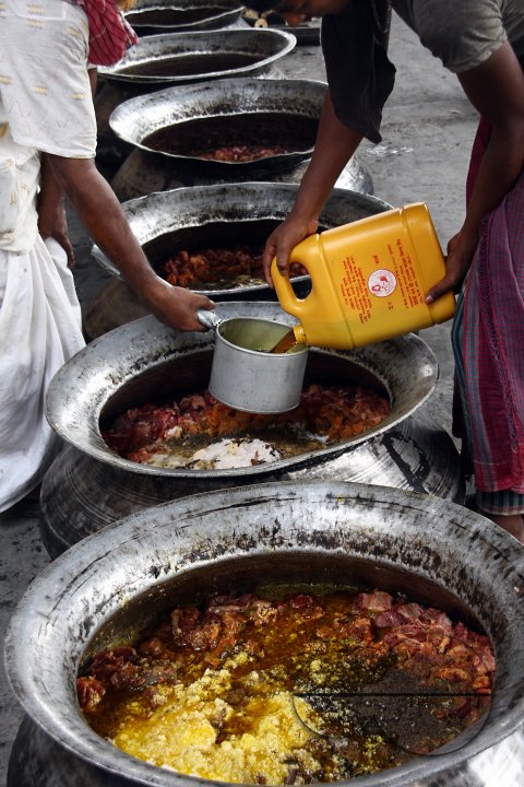 Description : Local chefs cooking food for a feast. Mezban (Persian word meaning ?host?) stands for community feast, with a simple menu of rice and beef-curry only. It?s a tradition of Chittagong mainly observed by the rich. Chiefly a mezban is held on the birth and death anniversary of the Prophet Muhammad (sm) that is 12th day of the lunar month Rabiul Awal. Besides, mezban is also held on other occasions such as the death anniversary of an individual, birth of a child or inauguration of a new business, or celebration of the entrance to a new residence. Winter is a popular season for organizing mezbans. Chittagong, Bangladesh.