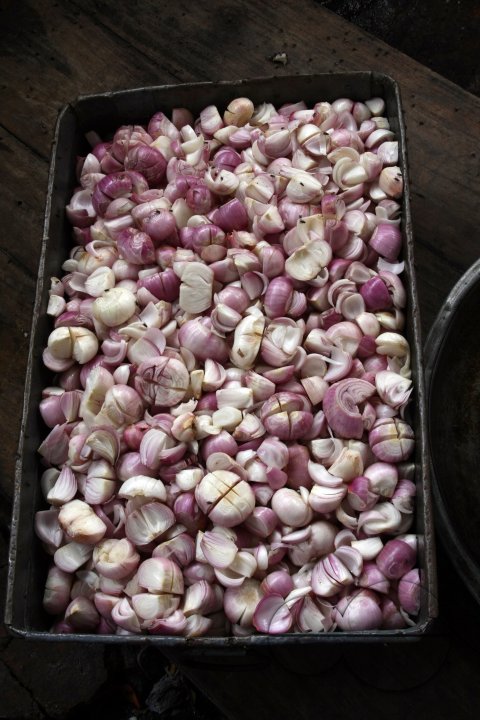 Description : Onions to be used in cooking food for a feast. Mezban (Persian word meaning host) stands for community feast, with a simple menu of rice and beef-curry only. It?s a tradition of Chittagong mainly observed by the rich. Chiefly a mezban is held on the birth and death anniversary of the Prophet Muhammad (sm) that is 12th day of the lunar month Rabiul Awal. Besides, mezban is also held on other occasions such as the death anniversary of an individual, birth of a child or inauguration of a new business, or celebration of the entrance to a new residence. Winter is a popular season for organizing mezbans. Chittagong, Bangladesh.