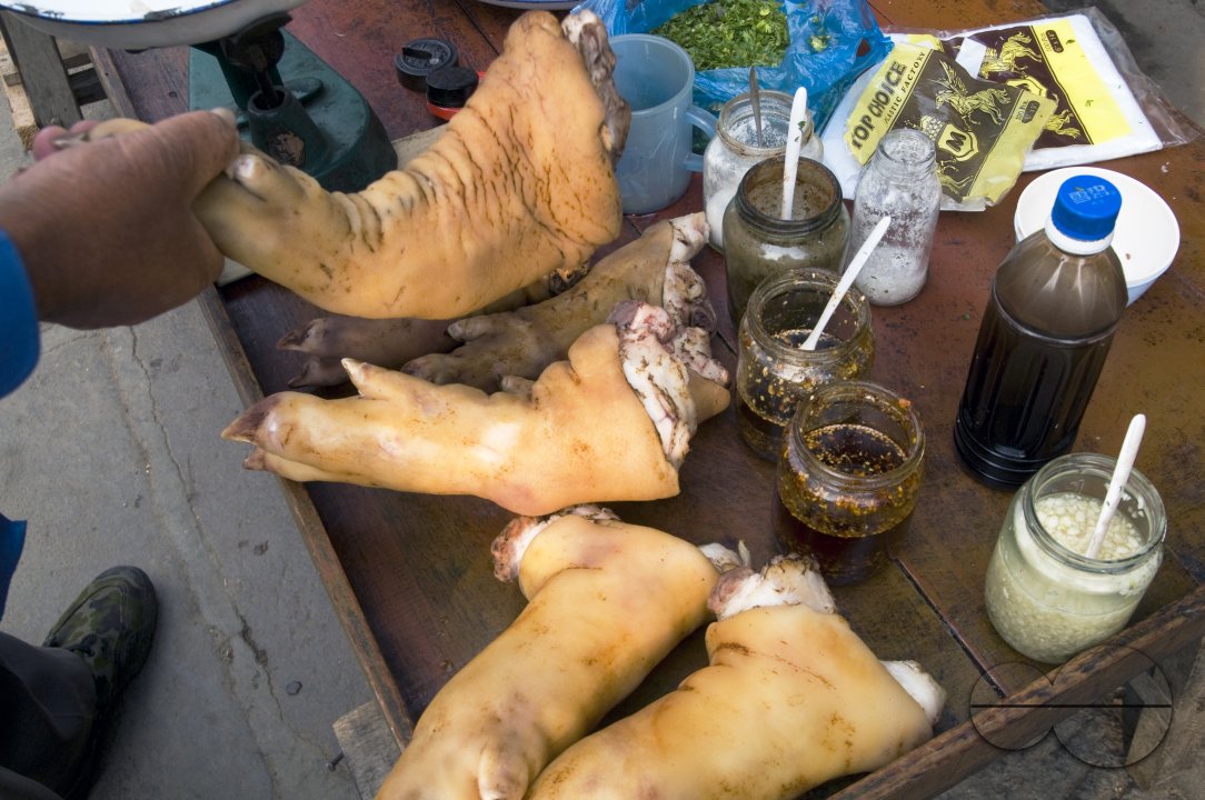 Description : CHINA Vendors selling meat at the market place in a village in Yunnan province.