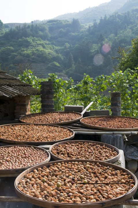 Description : CHINA Fruits drying in the sun in a village in Fujian province.