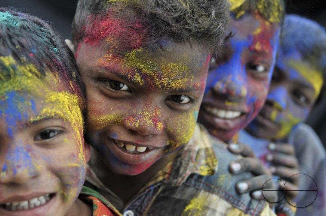 Description : Sylhet, Bangladesh. Four Bangladeshi Tea garden children posing with smile after adorning with colors on the celebration of the annual hindu festival of colours, known as Holi festival marking the onset of spring.