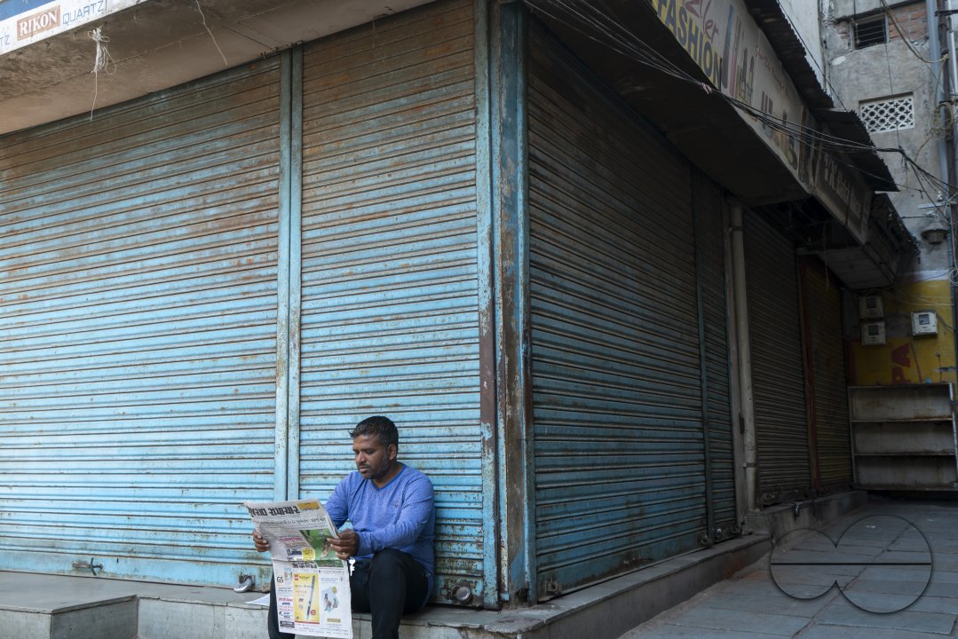 Description : A man reading a newspaper outside a closed shop. Khanderao Market is a sprawling market complex housing fruits, vegetables, flowers and other items. Khanderao Market is an ancestral heritage of Vadodara showcasing the glorious days of Gaekwad rulers, built by Maharaja Sayajirao Gaekwad III.