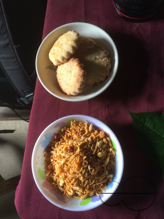 Description : Snacks for the passing guest are laid out on a table in Manikganj, a small town outside Dhaka, consisting of locally made biscuits and chanachur (a rice and gram flour fried spicy concoction, mixed with peanuts). Bangladesh.