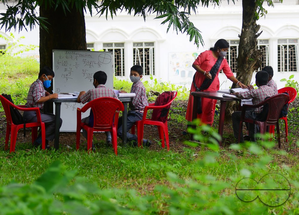 Description : The teachers of Henry Derozio Academy HS School are conducting classes outdoors, maintaining social distancing for the students who could not attend online classes. Due to the coronavirus studies were conducted online, but some students do not have the required internet facilities. Agartala, Tripura, India.
