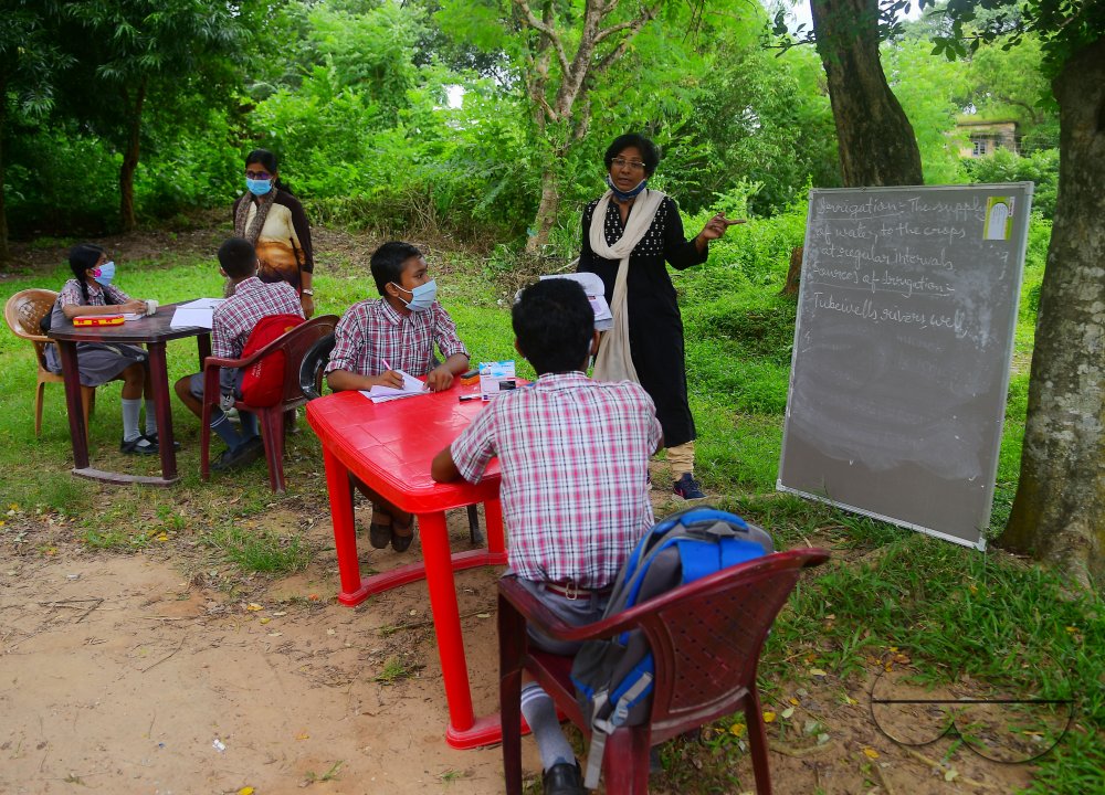 Description : The teachers of Henry Derozio Academy HS School are conducting classes outdoors, maintaining social distancing for the students who could not attend online classes. Due to the coronavirus studies were conducted online, but some students do not have the required internet facilities. Agartala, Tripura, India.