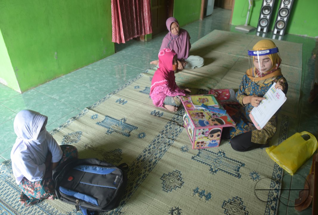 Description : A teacher from a public elementary school in Guli village central java, is teaching her students at a student`s house. The number of Covid-19 transmissions is still high, causing schools to be prohibited from carrying out normal activities. Studies are done online. However all parents of students in Guli village do not have cell phones.Therefore the teacher visits the students to help them study. Boyolali, Indonesia.