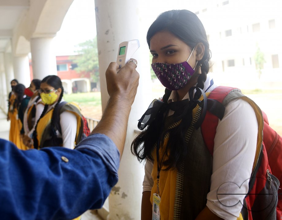 Description : Students get thermally scanned before entering the class on the first day of school which opened after along break. The Tripura government has allowed schools to function with strict adherence to the guidelines issued by the Ministry of Health due to the coronavirus pandemic. Agartala, Tripura, India.