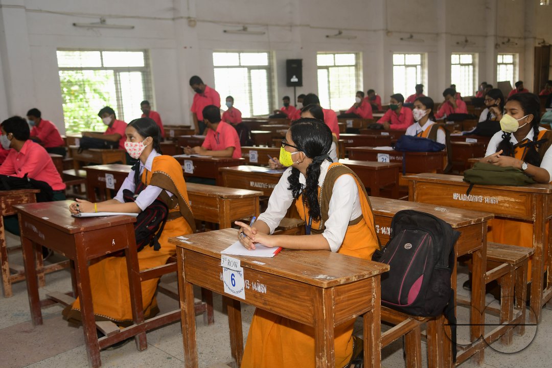Description : Students attending classes on the first day of school which opened after along break. The Tripura government has allowed schools to function with strict adherence to the guidelines issued by the Ministry of Health due to the coronavirus pandemic. Agartala, Tripura, India.