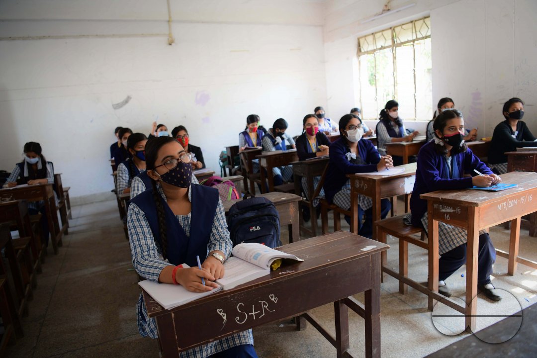 Description : Students wearing masks have attended the first day of school. The Tripura government has allowed schools from class five to class nine to start functioning with strict adherence to the norms issued by the Ministry of Health and family welfare in view of the coronavirus pandemic. Agartala, Tripura, India.
