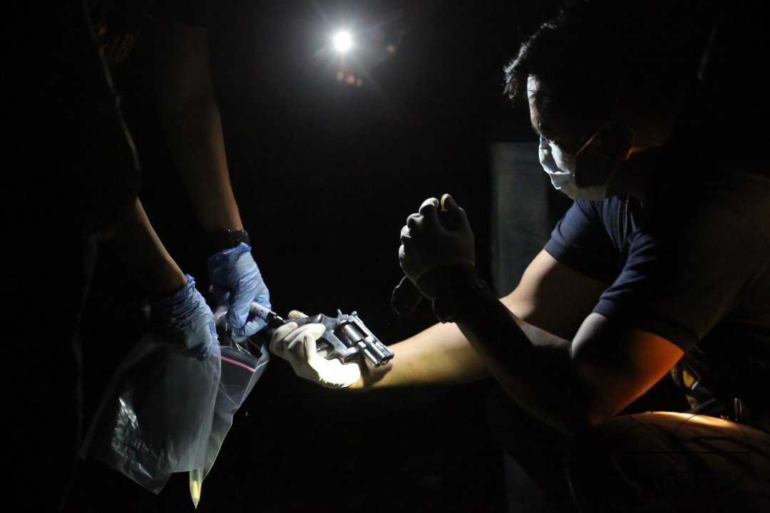 Description : Policemen check the gun recovered from one of two unidentified drug suspects after they were shot by dead by police during a buy-bust operation in Tondo, Manila on Friday. According to an international index, the Philippines is the second least peaceful country in the Asia-Pacific due to the government???s relentless anti-narcotics drive and the Marawi siege.