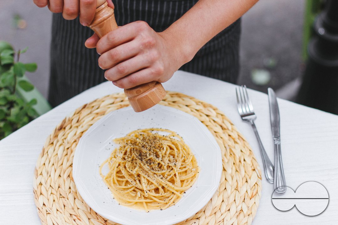 Description : A woman adds spices to a plate of pasta. Kazakhstan.