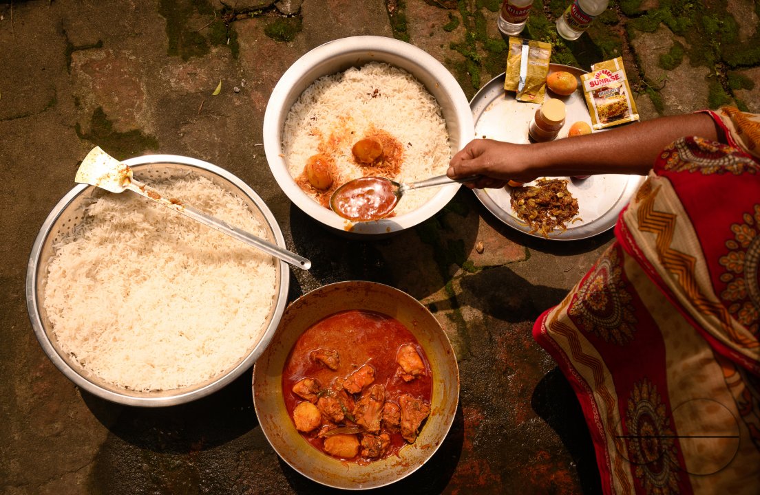 Description : A woman is cooking biryani. Biryani is an Indo-Aryan word derived from the Persian word 'Birian', which means fried before cooking and 'Birinj', the Persian word for rice. The Biryani is one of the most popular and ordered dishes in India. It is made with Indian spices, rice, and meat (chicken, beef, goat, lamb, prawn, fish), and sometimes, in addition, eggs or vegetables such as potatoes in certain regional varieties. There are various theories related to the origin of this scrumptious dish. Many historians believe that biryani originated from Persia and was brought to India by the Mughals. The modern biryani developed in the royal kitchens of the Mughal Empire and is a mix of the native spicy rice dishes of India and the Persian pilaf. Tehatta, West Bengal; India.
