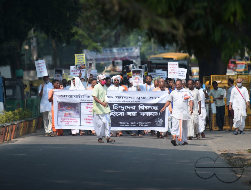 Description : Priests and followers of the ISKCON, at a peaceful prayer vigil to protest against the alleged attack on the ISKCON temple in Bangladesh and demanding justice for Hindus and minorities. The protest was held in front of the Bangladesh visa office in Agartala, Tripura, India.